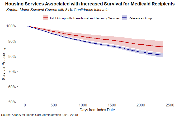 The script linked below uses a quasi-experimental design (propensity score matching), a weighted cox-proportional hazard model, and Kaplan-Meyer Survival Curves to analyze associations between Temporary Housing Pilot services and mortality across the entire Medicaid Waiver period (December 2019-June 2025).